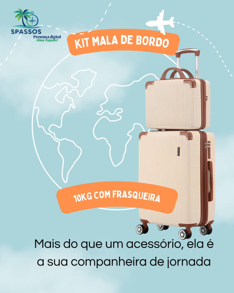 • Bagagem de mão: geralmente até 10kg e medidas próximas de 55cm x 35cm x 25cm.